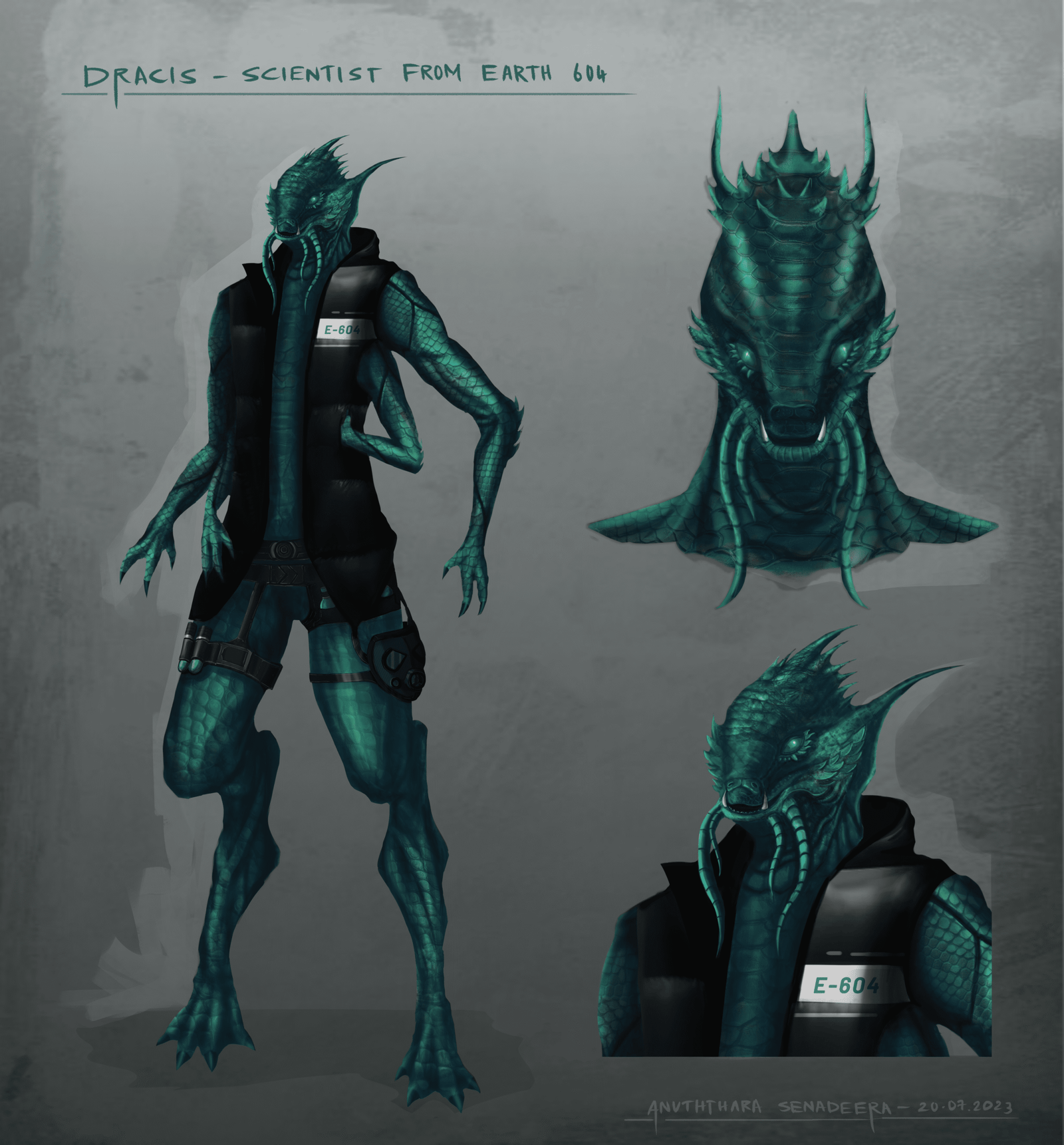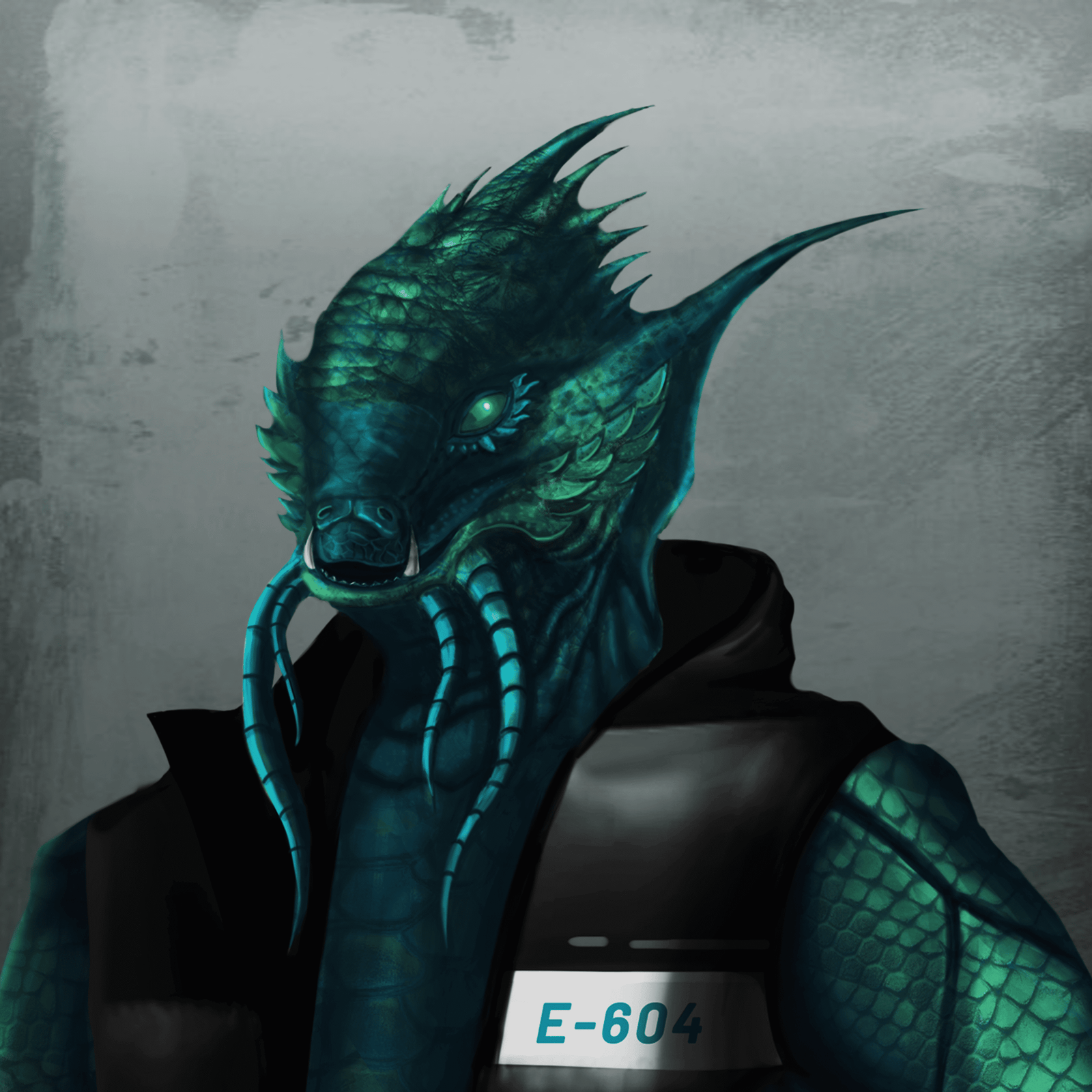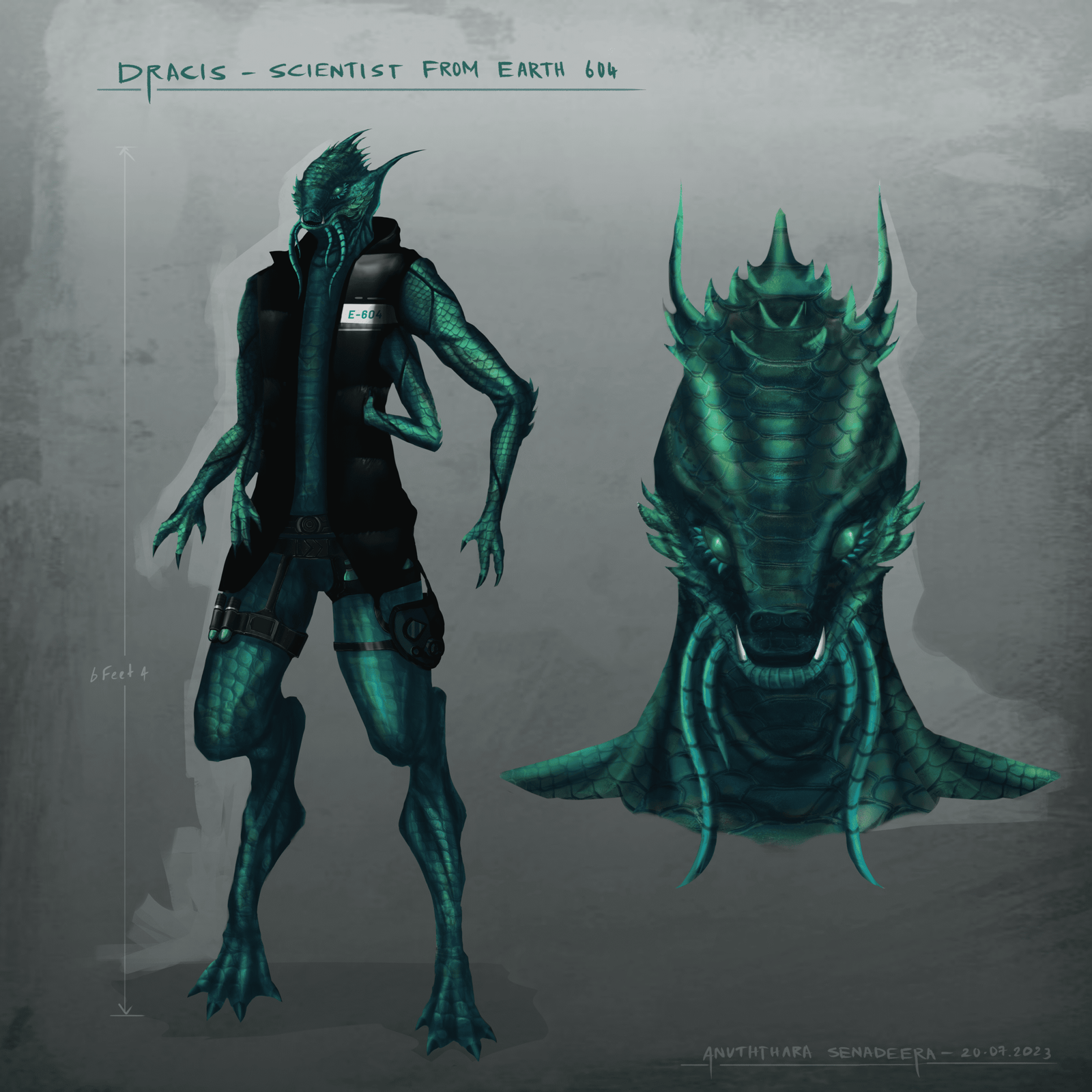 Dracis belonged to a highly intelligent and technologically advanced reptilian species known as the Lumineans. Standing tall at 6 feet 4 inches, he had a commanding presence with his erect posture and distinctive physical features. Unlike other Lumineans, Dracis possessed four arms, a genetic anomaly that made him both revered and feared among his own kind. His two strong legs allowed him to move with agility and grace, and his entire body was covered in mesmerizing greenish blue and green glowing scales, which gave him an otherworldly aura.